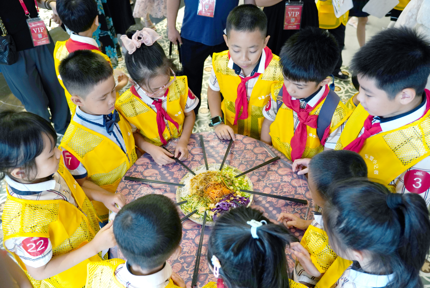 在馬來西亞館,東盟“小記者”們在現(xiàn)場親身體驗(yàn)了地道的東南亞華人傳統(tǒng)習(xí)俗——“撈生”儀式,即把裝在盤子里的食材用筷子反復(fù)高高夾起,“撈”得越高,寓意越吉祥。通過趣味“撈生”,寄語孩子們學(xué)習(xí)更上一層樓、德智體美勞全面發(fā)展的美好愿望。